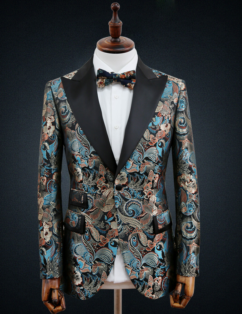 New and fashionable printing blue color men's suit with peak lapel